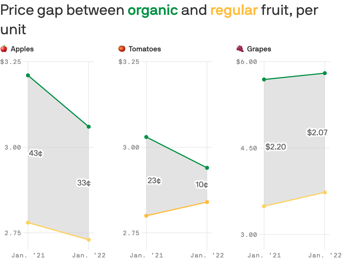 - ☝️ The difference in price between organic and regular fruit has fallen over the past year, with inflation hitting regular food (11%) harder than organic items (2% to 4%).