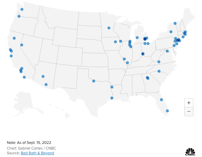 - ☝️ Bed Bath & Beyond is closing ~150 stores across North America; pictured above is a map of all the known locations that are going away for good. (Exact addresses in the link.)