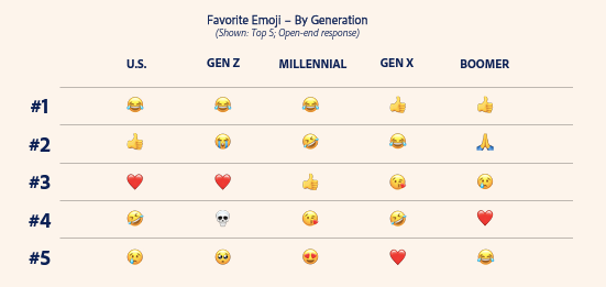 +The generational divide: Peep the top five most frequently-used emojis by generation below. (Can confirm: parents LOVE a good ‘ole thumbs up.)
