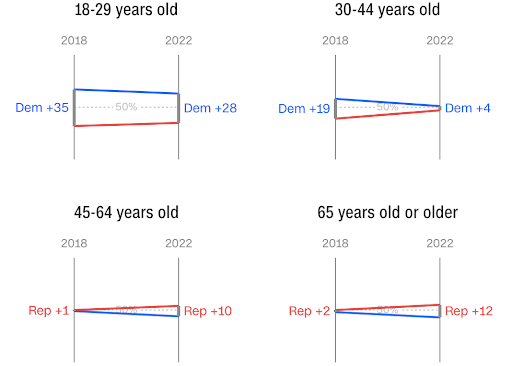 - ☝️ You’re looking at the results of the 2018 and 2022 midterm elections, broken down by age group.