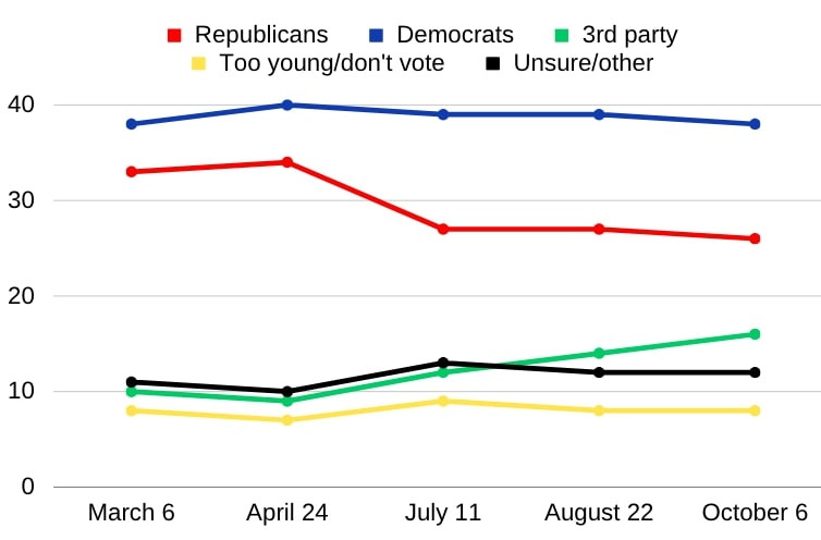 📊 Poll Results |  |  Note: Dates on x-axis aren’t spaced exactly apart | On Friday, we covered the upcoming 2024 presidential election cycle, which officially kicks off with Iowa’s first-in-the-nation GOP caucus on January 15.