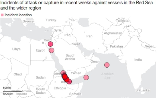 Our daily voyage around the world |  Image: Ambrey Analytics | 💥🚢 US and UK warships shot down one of the largest airstrikes from Houthi rebels in Yemen. A US official said yesterday’s barrage from Houthi rebels, who fired into a key Red Sea shipping lane, will likely elicit retaliatory airstrikes in the coming days. Many major international shipping companies have begun rerouting their ships away from the Red Sea passage – which facilitates ~15% of all global seaborne trade – in response to nearly two dozen Houthi attacks in the region since mid-November, when the militant group pledged to support Hamas against Israel.