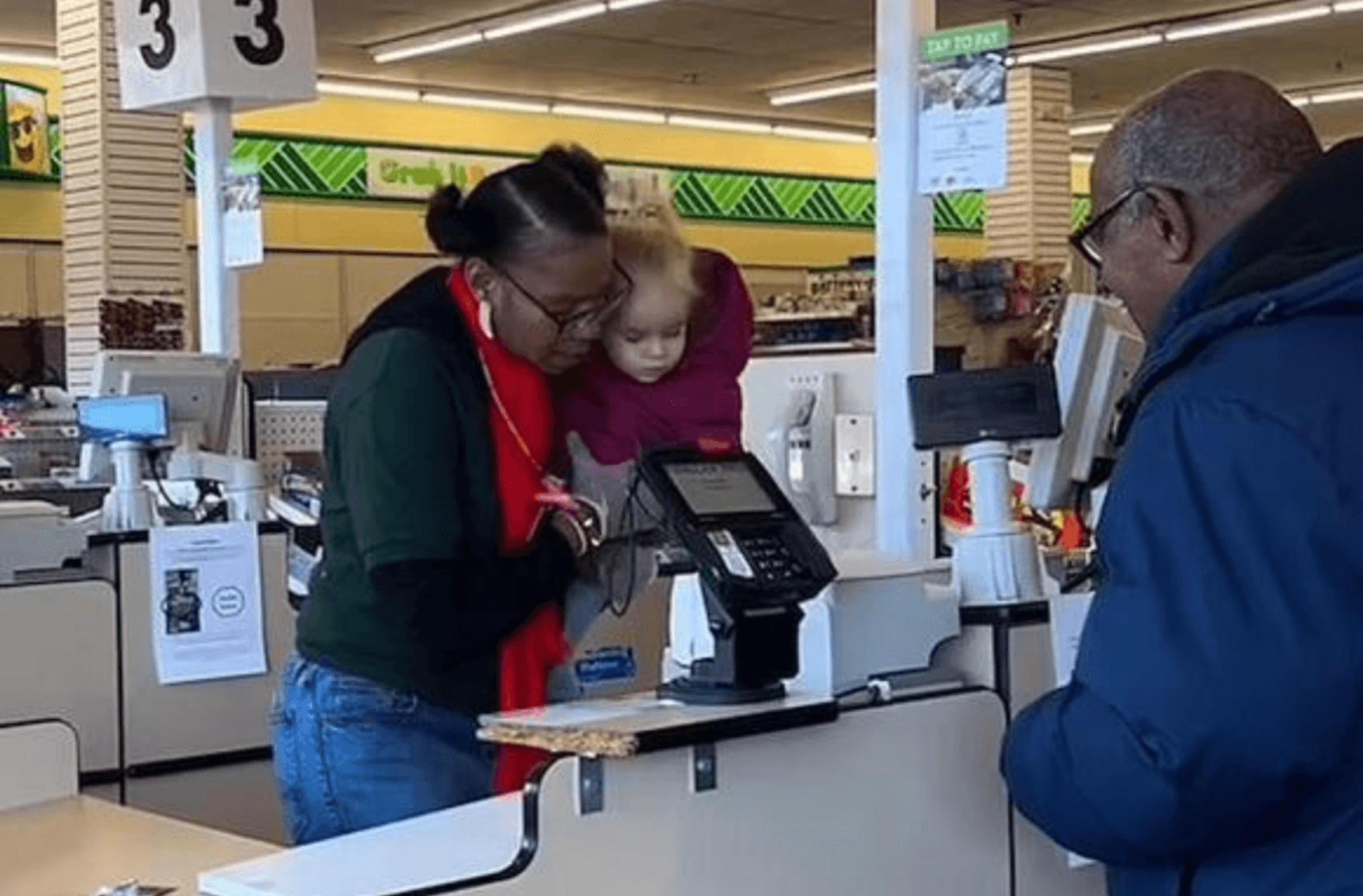 Then, cashier Fatimah Leftwich asked Mary-Ann if she could hold the toddler. Before both of them knew it, the two-year-old was behind the counter scanning items.