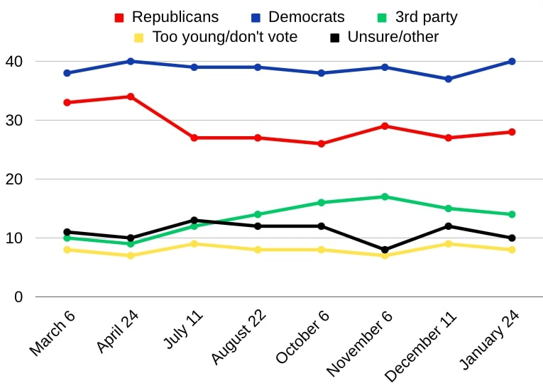 📊 Poll Results |  |  Note: Dates on x-axis aren’t spaced exactly apart | Yesterday, we covered how former President Trump and President Biden – who ran as a write-in candidate – both cruised to victory in their respective New Hampshire primary.
