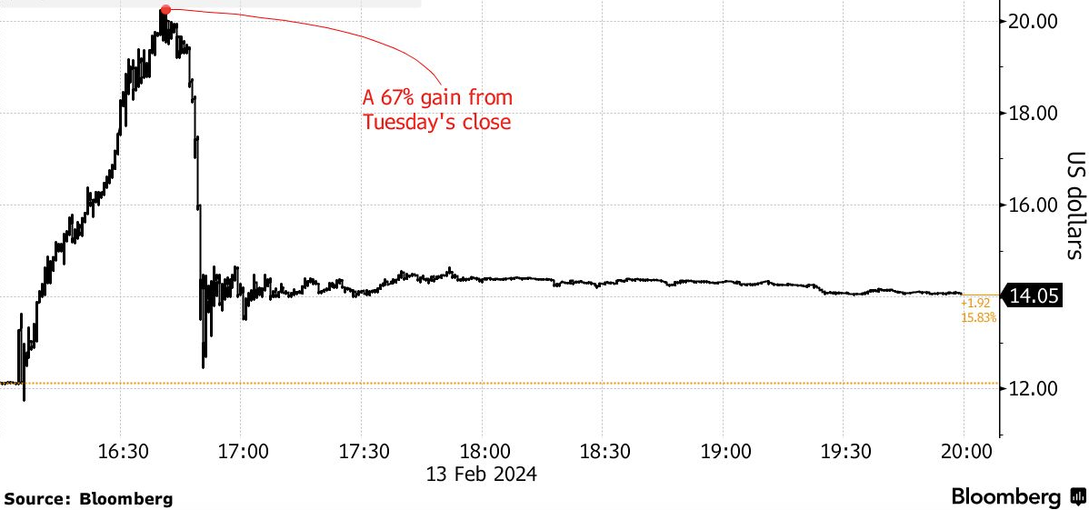 - Lyft’s shares rose nearly 70% in after-hours trading almost immediately after the initial earnings report was published – then fell sharply back to +16% after Lyft said its positive 2024 outlook was overstated, wiping out over $2 billion in market cap.