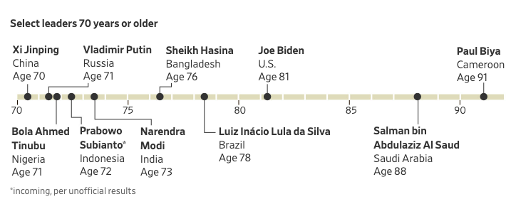 Our daily cruise around the world |  Image: WSJ | 🌎 Politicians above retirement age are increasingly leading the world’s largest nations. A decade ago, the world’s ten most populous countries featured a combined total of one leader aged 70 years or older. Today, that number is eight, covering more than half of the world’s entire population – and the two countries in that group who don’t have a 70+-year-old leader (Indonesia and Pakistan) are both expected to join the club following elections earlier this month. Experts attribute the recent trend to several factors, including autocrats strengthening their grip on power as well as rising barriers to entry for leadership elections.