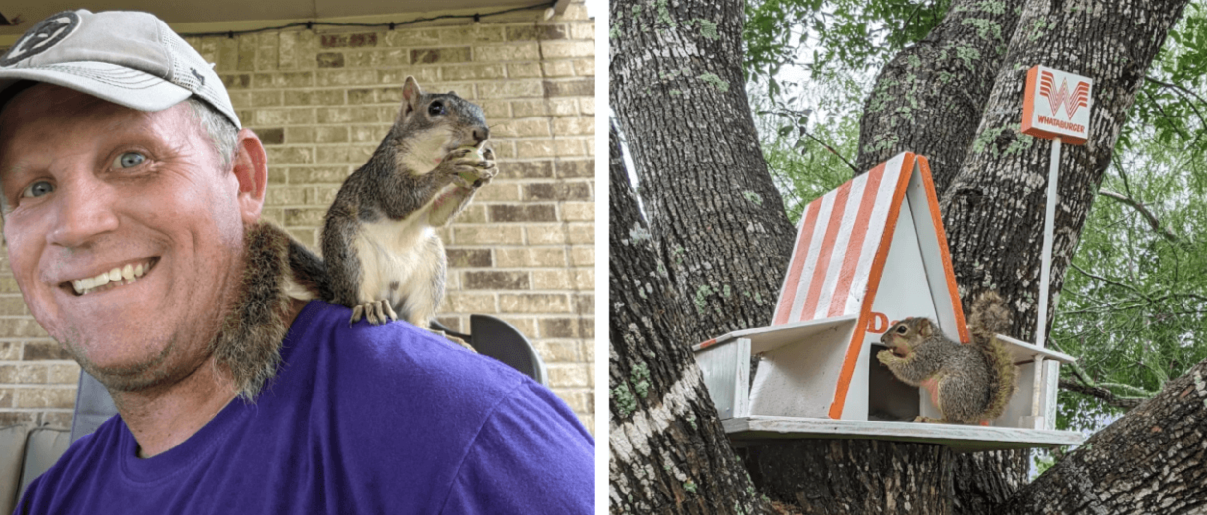 👏🔦 The Sweet Spotlight |  | 🐿🍔 When Chip & Dale's meets Whataburger |  Images: Keith Morgan | Back in 2021, Keith Morgan and his daughters spotted their cat batting something around outside. After rushing out to the backyard, they were surprised to find two baby squirrels beneath their pecan tree. They attempted to put the pups back in the tree, in hopes of the squirrels' mother bringing them up to the nest, but ultimately determined they were orphans. Luckily, the family was familiar with caring for rodents, and already had a rabbit cage set up in the back yard. For the next two weeks, they tried to nurse the squirrels back to health after their falls. - They named them – fittingly – Chip and Dale.