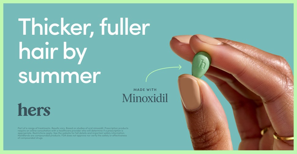| Much more than a supplement, Hers combines Rx ingredients with hair-supporting vitamins to not only regrow hair, but help it thrive. A licensed provider will review your information and recommend the best dermatologist-trusted formula for you. The outcome: see thicker, fuller hair in as little as 3-6 months, thanks to clinically proven ingredients*: - β€οΈ Boost blood flow to the hair follicles to extend the active growth phase
