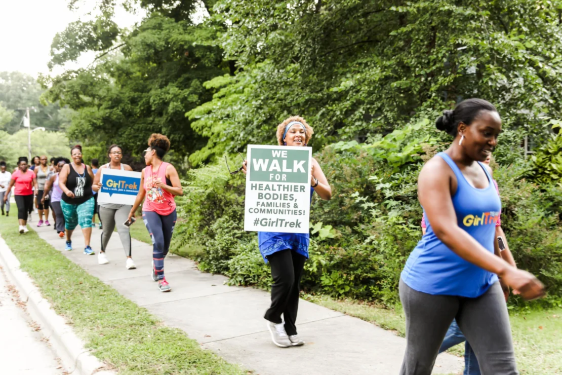- GirlTrek has also morphed in part into a support community, where women who are alone or suffering any kind of depression/anxiety/stress can walk, talk, and slow down with friends.
