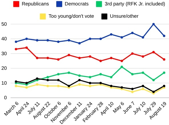 📊 Poll Results |  |  Note: Harris replaced Biden prior to July 29 poll; dates on x-axis aren’t spaced exactly apart | Yesterday, we covered where Vice President Kamala Harris and former President Trump stand on many of the key issues for American voters. ❓ Our question to you: If the November election was held today, which candidate would you vote for? - Former President Trump: 26%