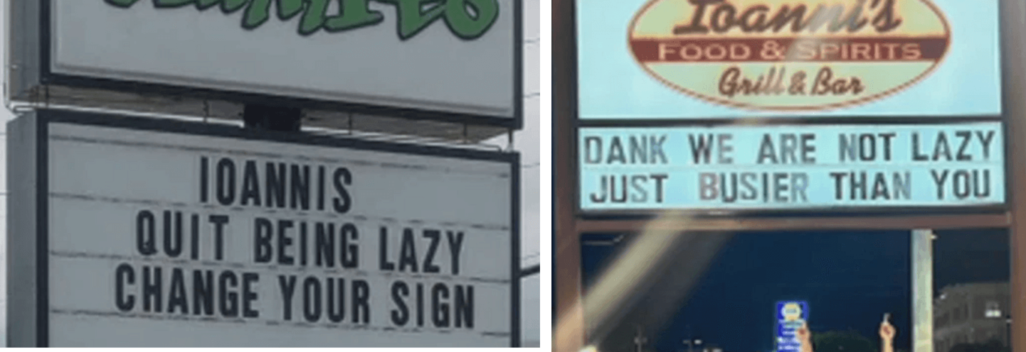 🤗 Daily Dose of Positive |  | The Great Sign War |  Images: ABC News12 | It all started when Ioanni's Grill & Bar in Morehead City, North Carolina, had a "Happy Birthday" sign up for nearly a month. In a bit of lighthearted fun, Dank Burrito owner Clarke Merrell put up an opposing sign across the street poking fun at Ioanni's situation. - And thus, the "Great Sign War" began. The two restaurants went back and forth for days with hilarious signs that had passersby stopping for photos along the road.