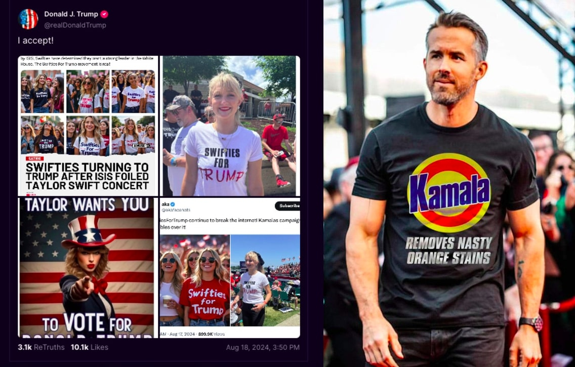 AI is playing the role of “Anti-Hero” this election season |  Images: Truth Social/Verify This | Unlike what you may have recently seen on social media, Taylor Swift didn’t endorse former President Trump earlier this month; Ryan Reynolds wasn’t photographed wearing a pro-Kamala Harris shirt; and Trump wasn’t captured on camera planning his own assassination attempt with the man who shot him. - These false claims and dozens of others have gone viral in recent weeks thanks to AI-enhanced tools, according to a newly launched database from researchers at the News Literacy Project, a nonpartisan education group.