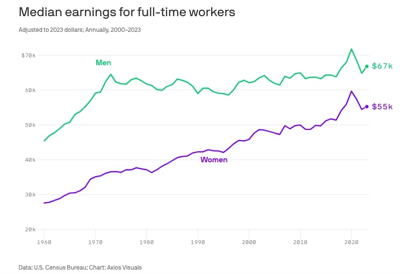 | Last year, US men and women both saw their respective paychecks get fatter, on average – but the wage gap between genders also widened for the first time in over two decades, per new Census Bureau figures published this week. Let’s break it down: Census data shows median earnings for US men rose at an annual rate of 3% last year, compared to 1.5% for women. Overall, the median woman working full-time in 2023 made $55,240, compared to a salary of $66,790 for the median man (or 83% as much). - This ratio is above pre-pandemic levels, but down slightly from 84% in 2022.