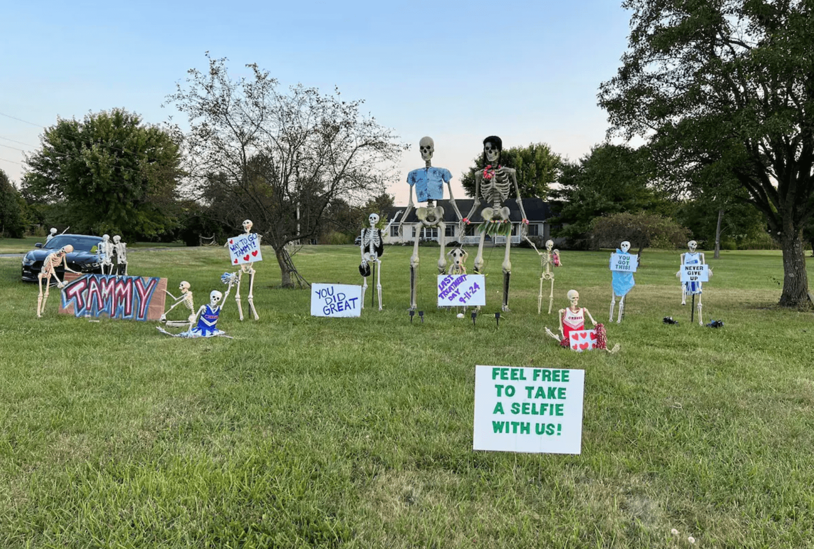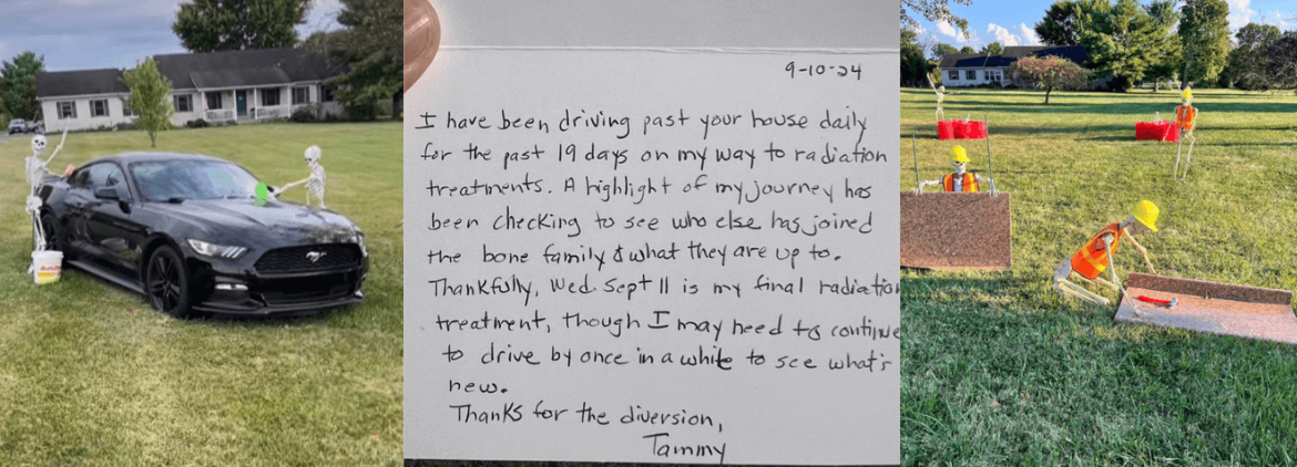 ππ¦ The Sweet Spotlight |  | π The story of the skeletons |  Images: Billy Pyles | π When is it too early to start decorating for Halloween? For Ohio resident Bill Pyles and his family, the answer is never; their decor has already been out for weeks. The Pyles Family has spent the last few years leading up to Halloween decorating their yard with skeleton statues of all shapes and sizes in various scenarios. The skeletons have been spotted washing cars, playing cornhole, bowling, and more, and the foreman family changes these "tasks" twice weekly. But while some may say mid-August is a bit too early to start with the Halloween displays, for fellow Ohio resident Tammy Weihe, this year they were a welcome distraction. - The Oxford resident was diagnosed with breast cancer back in May, and had to drive by the Pyles house every day on her way to radiation treatments with her husband. The day before her final treatment, she decided to leave the family a note in their mailbox: