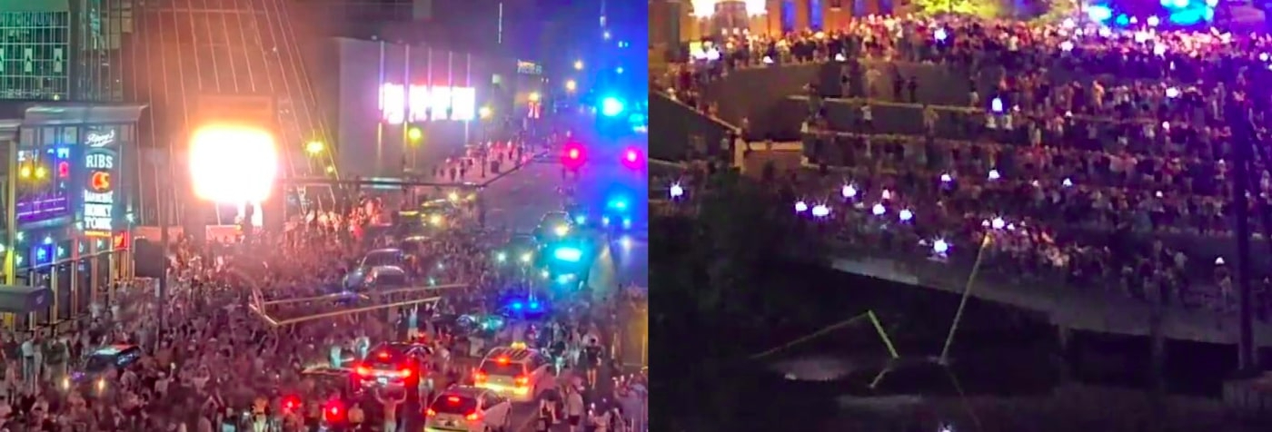 |  Images: ESPN | X | 🏈🙌 Vandy took down #1 Alabama – and its own goalposts. On Saturday night, Vanderbilt students tore down their stadiums’ goalposts in celebration of a historic 40-35 upset win over #1 Alabama. Students then proceeded to carry the goalposts some two miles to downtown Nashville, where they paraded down Broadway (left👆) before tossing the posts into the Cumberland River (right). Prior to Saturday, Vanderbilt had lost all 60 of its games against AP top-five teams. |