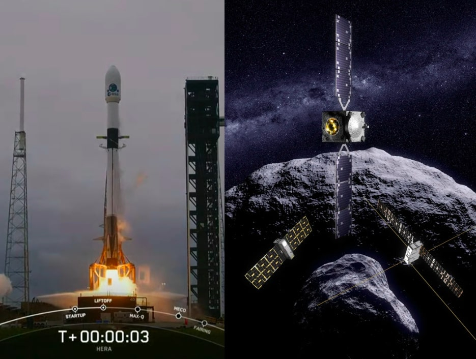 |  Hera’s launch (left) and artist’s depiction of the mission in action (right); Image: ESA | 🚀☄️ A European spacecraft set off on an asteroid “crime scene investigation.” The European Space Agency’s Hera mission aims to survey the aftermath from NASA’s 2022 DART mission, in which a spacecraft was intentionally slammed into an asteroid to alter its trajectory. The Hera spacecraft and two shoebox-size satellites lifted off aboard a SpaceX Falcon 9 rocket yesterday, and will arrive at their destination in late 2026. |