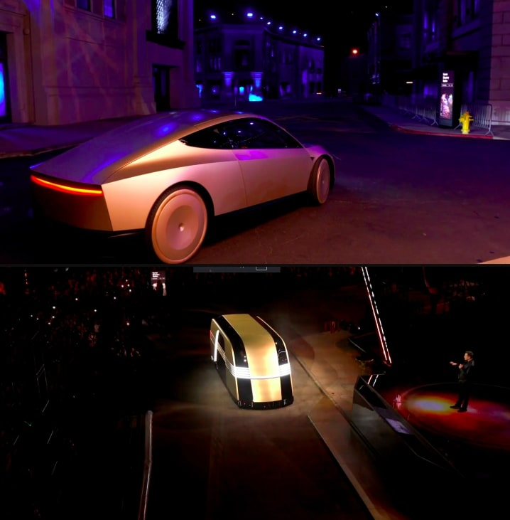 |  Images: Tesla | 🤖🚖 Tesla unveiled its “Cybercab” robotaxi last night. In its “We, Robot” event, which was live streamed on X, Tesla CEO Elon Musk unveiled the Cybercab (☝️ top), which has no pedals or steering wheel, and said will go on sale next year for less than $30,000. Musk also revealed a surprise prototype called the Robovan (bottom) that can carry up to 20 people. |