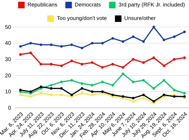 📊 Poll Results |  |  Note: Harris replaced Biden prior to poll on July 29, 2024; dates on x-axis aren’t spaced exactly apart | Yesterday, we covered how the 2024 election is just under three weeks away – but for many voters, Election Day is already here. ❓ Our question to you: If you were going to vote in the 2024 presidential election today, which candidate would you choose? - Former President Trump: 31%