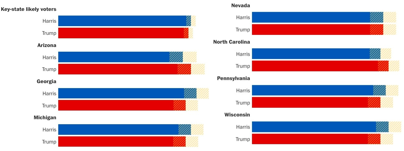 |  Image: Emily Guskin/WaPo | 🗳️ New polling shows a deadlocked presidential race across key swing states. A new Washington Post-Schar School survey of seven battleground states found Harris holds a slight 49%-48% advantage over Trump among likely voters. The survey also found US voters trusted Trump over Harris on the economy and immigration, while the opposite was true for crime, abortion, and climate change. |