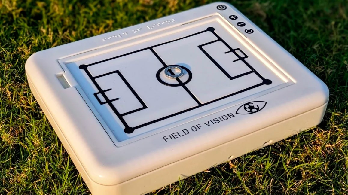 Companies are bringing accessibility to live entertainment |  Image: Field of Vision | “They shoot, they score! And the crowd goes wild!” – that is, unless you can't see the play. Such is often the case for blind and low-vision sports fans, who struggle to follow sports games while in attendance due to delays or volume problems with audio descriptions. But a first-of-its-kind accessibility tool from Irish company Field of Vision aims to change that by allowing visually impaired sports fans to “feel” the game in real time. How it works: The Field of Vision device uses a combination of AI and cameras to send live signals to a tablet-sized device sitting in the user’s lap. The game information is then transmitted to the tablet after a ~0.5-second delay, with a magnetic ring guiding the user’s finger around the miniature field based on where the ball (or puck) is. - It also vibrates to convey different game events, such as a tackle or change in possession.
