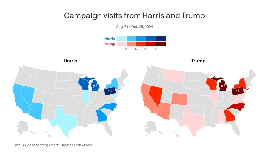 | 🗳️ The presidential candidates have narrowed their campaigns to mostly swing states. Since Vice President Harris became the Democratic nominee on August 5, both her and former President Trump have spent the most time in Pennsylvania and Michigan, while entirely avoiding events in 36 non-swing states. Outside of in-person events, both candidates’ last-minute online campaigns are in full swing, including Trump’s appearance on The Joe Rogan Experience on Friday. |