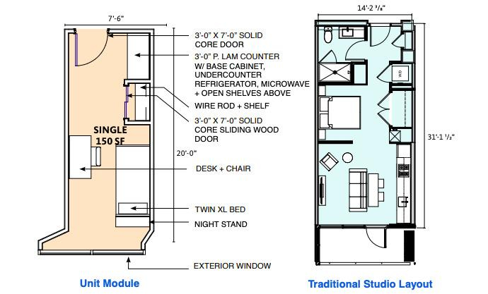Researchers think adult dorms could help solve America’s housing shortage |  Image: A proposed micro-apartment in Denver compared to a typical studio apartment; Pew/Gensler | Adults looking to relive at least some of their college experience may soon be in luck. A recent proposal from the Pew Charitable Trusts and architecture-design firm Gensler posits that converting empty office buildings into a series of micro-apartment units could help solve America’s housing shortage and affordability problem. - Bridging the gap: ~20% of US office buildings are still vacant following Covid (a figure even higher in certain areas), while at the same time the country is facing a residential housing shortage in the ballpark of 4 million–7 million homes.