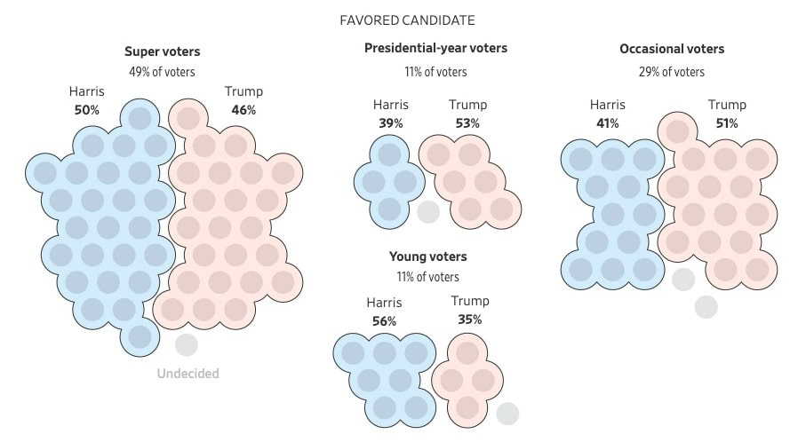 These infrequent voters will likely decide the election“Super voters,” a group defined as showing up for every presidential and midterm election since 2016, have favored Harris over Trump by a margin of at least 4% in every Wall Street Journal survey this year. But that group only represents 49% of the US electorate, meaning the race will likely come down to whether Trump can make up those 4+ points from the other half of the voter pool – which views him more favorably. - Among US voters who only cast ballots in presidential years, Trump holds a 14 point lead over Harris.