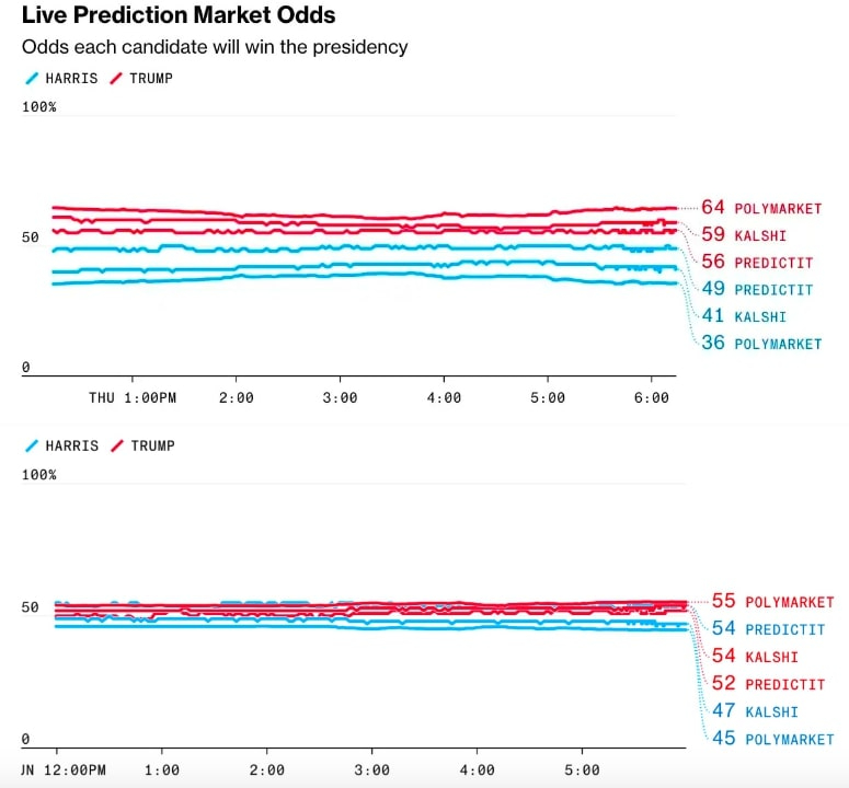 |  Presidential betting markets on Thursday (top) and Sunday (bottom) Images: Bloomberg | 🗳️ Betting markets show the presidential race has tightened since Thursday. Harris gained ground against Trump across all three major election betting sites over the weekend. When it comes to polling, Harris holds a slight lead over Trump in FiveThirtyEight’s national polling aggregator (+1.0%), while Trump has pulled ahead in polls aggregated by RealClearPolitics (+0.1%). |