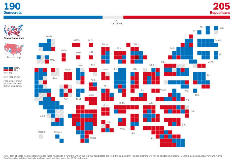 Pics du jour |  Races updated as of 4:30 am ET; Image: NY Times | 🏛️ Republicans appear favored to win the House, though the race is still tight. The GOP has blocked some of Democrats’ pathways to victory in the House, though dozens of races remained too close to call as of 4:30 am ET. In the Senate, Republicans have already guaranteed themselves a majority with four races left to call, earning 52 seats vs. 44 for Democrats thus far. |