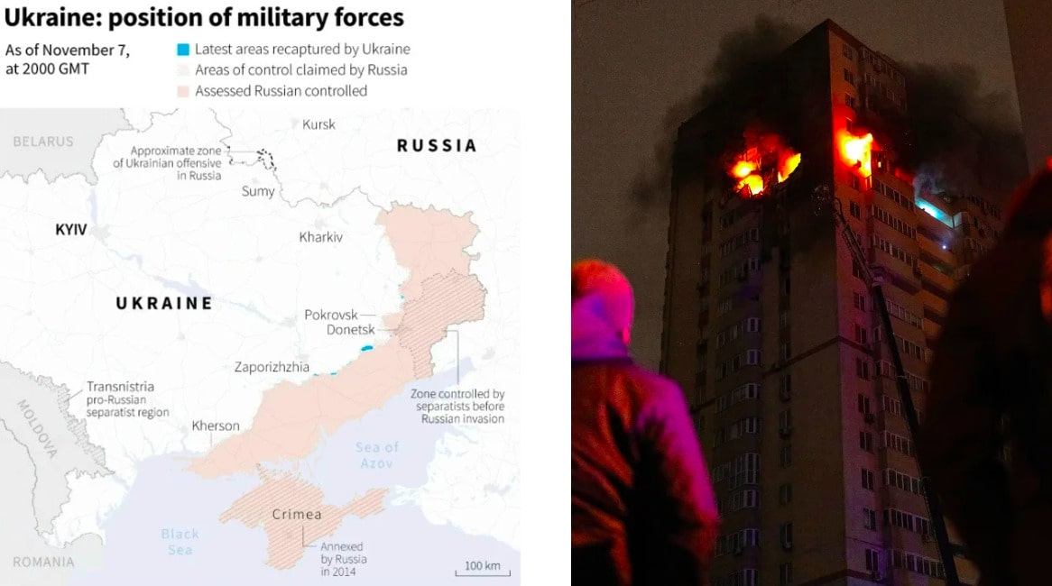 Pics du jour |  Images: Oleksii Filippov/AFP/Getty | 💥 Fighting in the Russia-Ukraine war is escalating once more. The two countries exchanged unprecedented drone strikes over the weekend, with Ukraine launching a record 30 drones at Moscow and Russia firing 145 drones into Ukraine (a single-night record). The attacks come as ~50,000 Russian and North Korean soldiers have amassed in Russia’s Kursk region ahead of an expected counteroffensive to retake Ukrainian-seized territory in Kursk, which could launch within days. |