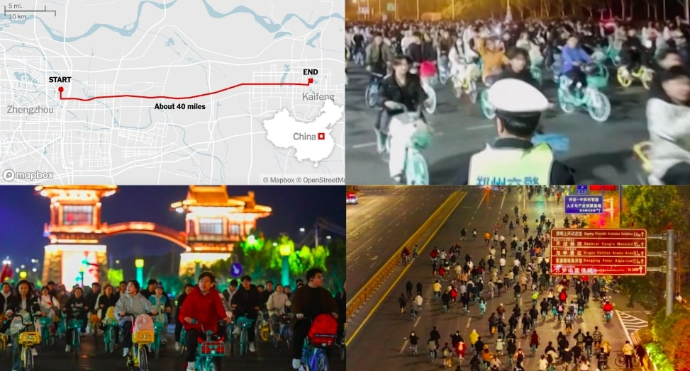 |  Images: Agnes Chang | Reuters | Jiao Xiaoxiang/VCG/Getty | 🇨🇳 Four friends in China started a massive night-cycling trend – and were shut down by the cops. According to Chinese media, the trend began in June, when four college friends biked ~40 miles from Zhengzhou to Kaifeng to eat a type of soup dumpling for which the city is famous. Soon, hordes of college students were also making the trip. The situation came to a head on Friday, when ~100,000 people joined the cycling journey. The massive crowd jammed major roads, overwhelmed a small city, and prompted authorities to ban future journeys over safety concerns. |