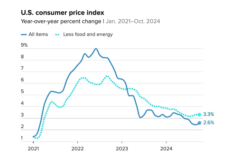 |  Image: US Bureau of Labor Statistics/CNBC | 📈 Annual US inflation stood at 2.6% last month, per the October CPI. That’s in line with analysts' expectations but up from 2.4% in September, with roughly half of the increase attributed to rising shelter prices. On a monthly basis, the CPI rose 0.2% in October. Core inflation, which excludes often-volatile food and energy prices, rose 0.3% for the month and 3.3% annually. Despite the monthly uptick in prices, the Fed is still widely expected to cut US interest rates for a third straight time following its next meeting in December. |