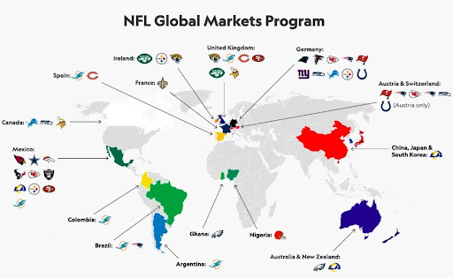 Divide and conquerMuch like territorial maps of yore, the NFL has divided up the globe among different teams through its Global Markets Program. Within the program, all 32 clubs have the option to apply for marketing rights to a specific territory on an annual basis, with no limits currently set on how many teams can target a certain market. - This season, 25 franchises are participating in the program across 19 international markets (shown above☝️).