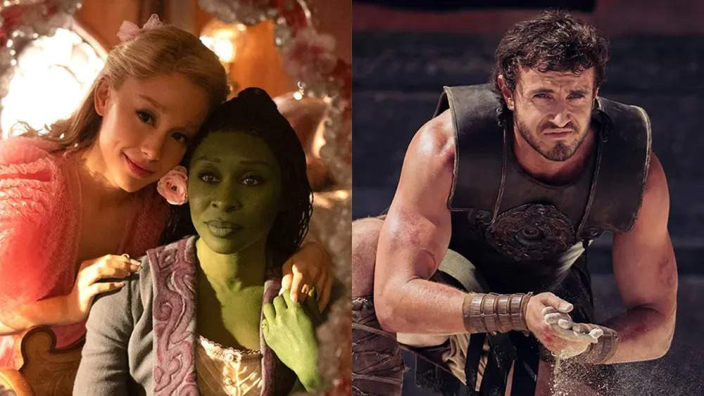“Glicked” kicks off Hollywood’s Thanksgiving festivities |  Image: Giles Keyte/Universal Pictures; Paramount Pictures | Gladiator II and Wicked both hit theaters today, ahead of the five-day Thanksgiving weekend, kicking off an important stretch at the US box office for the movie industry. - Gladiator II: The Ridley Scott-directed sequel is projected to make between $65 million–$75 million domestically in its opening weekend.