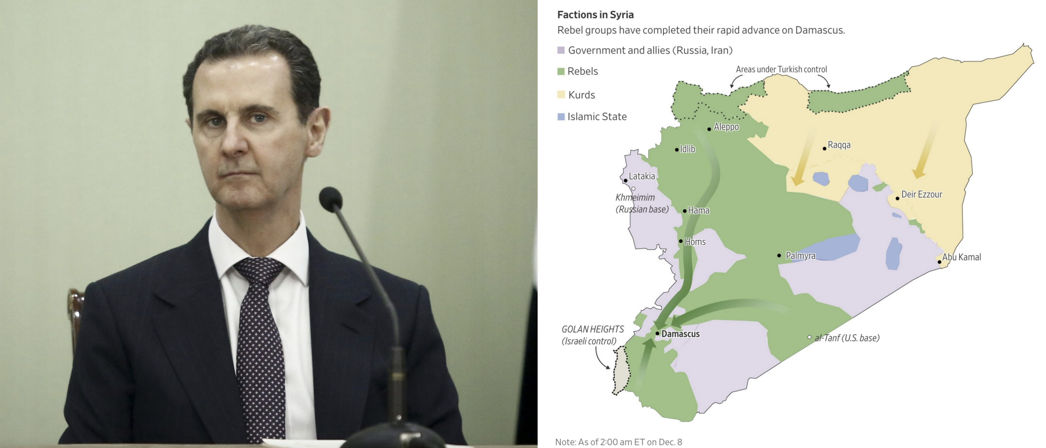 |  Images: Getty | LiveUAmap/James Benedict/WSJ | 🇸🇾 Syrian President Bashar al-Assad was ousted by rebel forces. Assad, whose family’s 50-year rule over Syria is widely described as a dictatorship, stepped down as president and fled to Moscow yesterday after Syrian rebels took control of the capital city of Damascus. It caps off 10 days of surprise military advances from Syrian rebel forces, who captured five major cities from Assad’s government over the period. In a statement, President Biden called the fall of Assad a “fundamental act of justice” but also a “moment of risk and uncertainty,” saying the US will continue to monitor the actions of rebel groups in Syria. President-elect Trump reacted to Assad’s ousting by highlighting the weakened state of Russia – an ally of Assad’s government – and calling for an “immediate ceasefire” in the Russia-Ukraine war. |