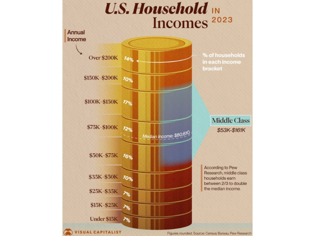 🍩 DONUT Holes |  |  Image: The Visual Capitalist | - ☝️ America’s middle class – defined as households making between two-thirds and double the median income – contained ~40% of all US households last year, per Census Bureau data (via The Visual Capitalist).