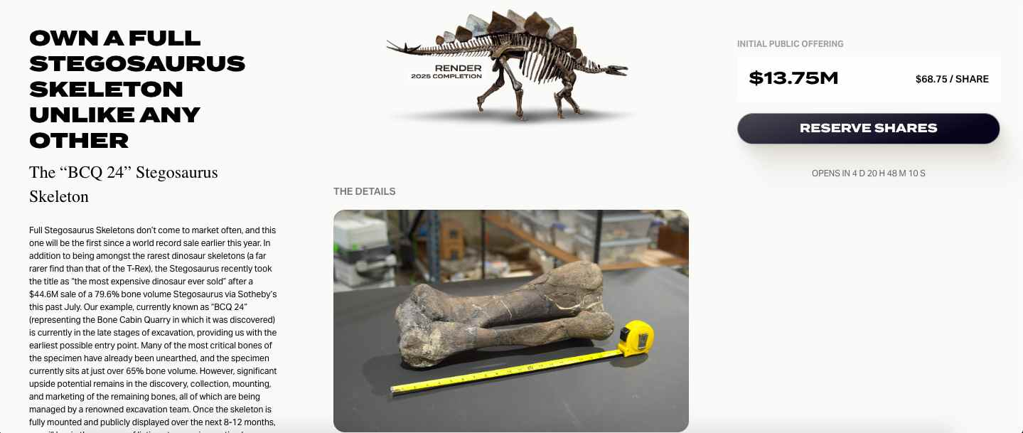 ⏱💥 Speed Rounds: Quick, Impactful Stories |  | Anyone could soon own a piece of a dinosaur |  Image: Screenshot | Jurassic Park enthusiast? Mark your calendar. Rally, an alternative asset investment platform, is launching an IPO for a stegosaurus skeleton later this month. The 160-million-year-old skeleton, nicknamed “Steg,” is being valued at $13.75 million. And with 200,000 shares becoming available, this means anyone with $68.75 to blow could own a piece of The Land Before Time (though similar to an NFT, you can look, but you can’t touch). - Rally plans to display the skeleton – ~69% of which has been recovered so far – for 8-12 months, then explore a sale via auction house.