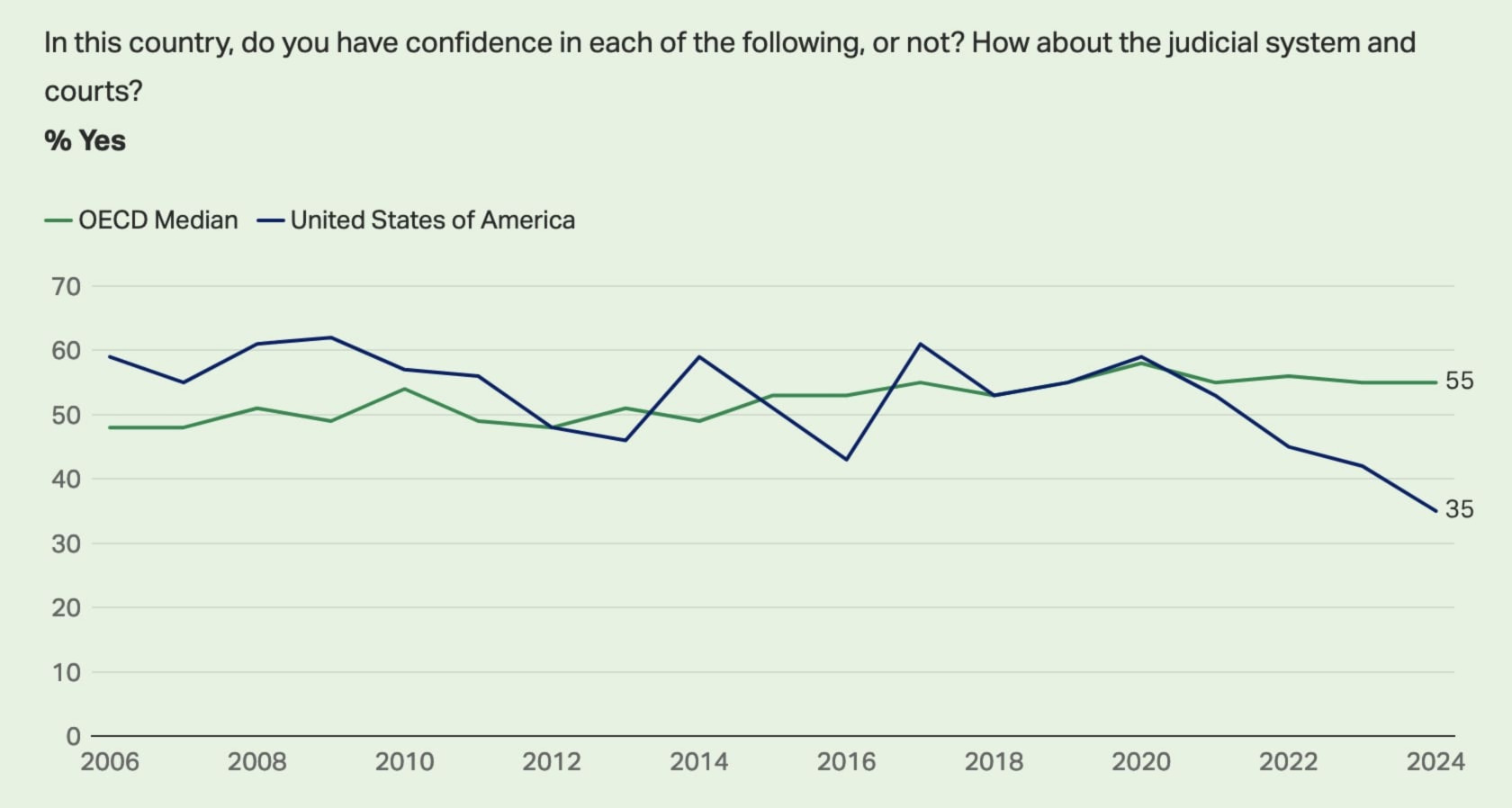 - But the US has seen a sharp decline in judicial confidence since that point, falling from 59% in 2020 to a record-low 35% in 2024.