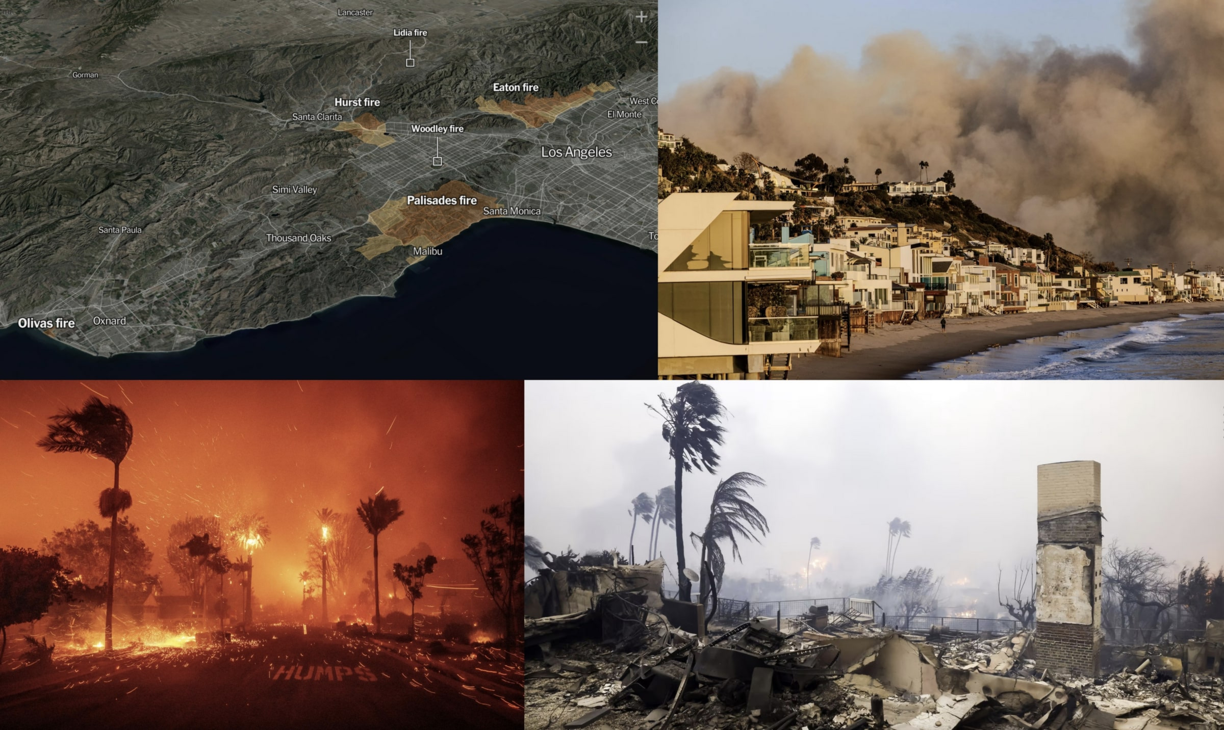 LA is fighting historically destructive wildfires |  Images: Cal Fire/Mapbox | Amy Katz/Zuma Press | Ethan Swope/AP | Caroline Brehman/Shutterstock | Los Angeles County firefighters are struggling to handle a series of ongoing and deadly wildfires, which have grown more dangerous and destructive in recent days due to a powerful windstorm. What’s going on? As of yesterday evening, there were six wildfires raging across Los Angeles county: the larger Palisades and Eaton fires (covering 10,000+ acres apiece), as well as four smaller blazes covering ~500 acres or less. Local firefighters are struggling to handle the fast-moving fires, which were all 0% contained as of last night. - Officials said the Eaton fire had caused at least five deaths, while the Palisades fire had destroyed 1,000+ structures to become the most destructive fire in city history.