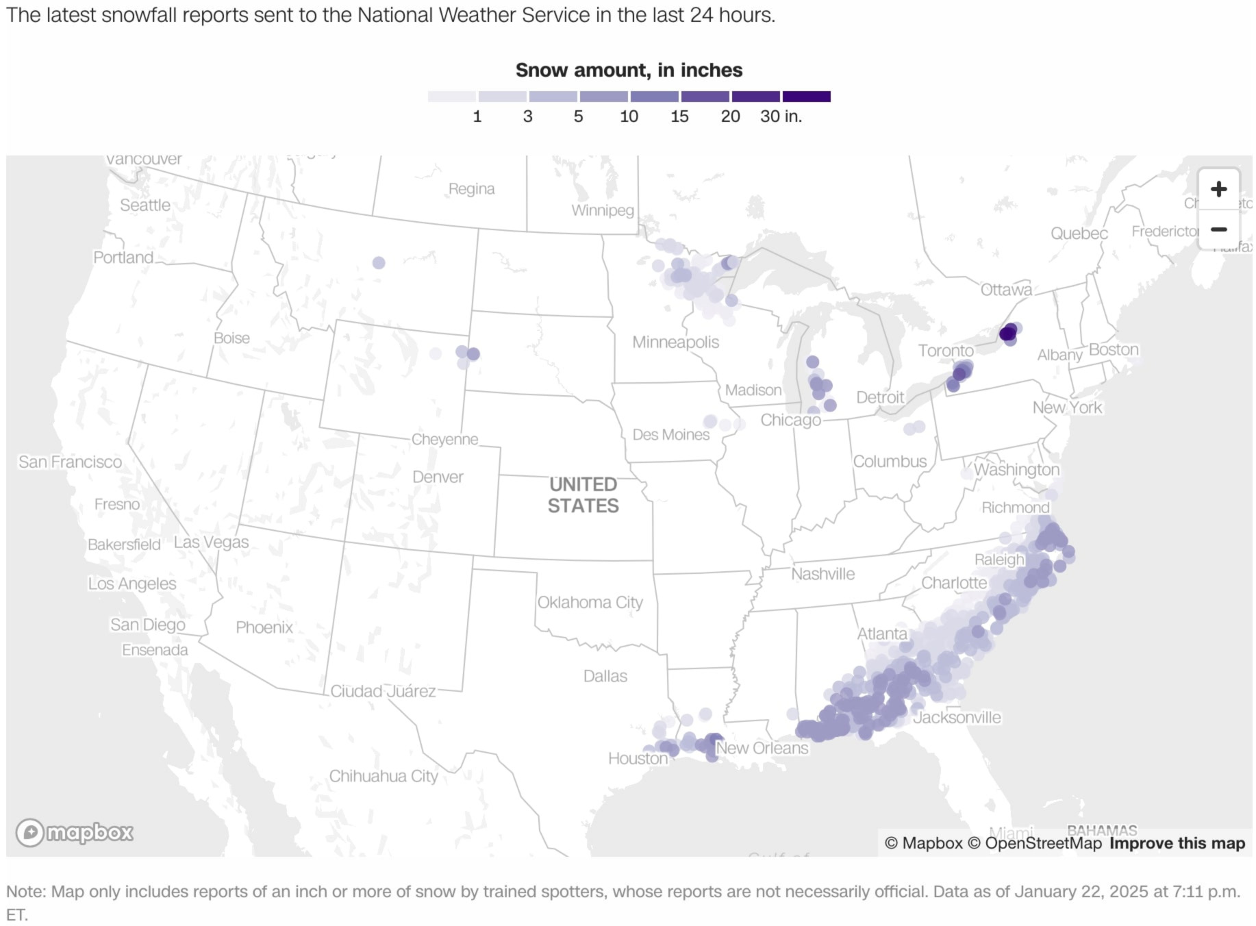 🧠 Tidbits |  |  Image: Matt Stiles/CNN/National Weather Service | ☝️ ❄️ Polar vortex update: Millions of Americans remained under cold weather advisories yesterday; nationwide, at least 10 deaths have been reported due to the cold and winter storm, which contributed to 5,500 canceled or delayed flights on Wednesday. 🤔 Did You Know? The first known use of “OMG” can be found in a 1917 letter to Winston Churchill – though the term didn’t gain widespread popularity until the Internet Age. 📰 Worth a Read: How corn syrup took over America. 🖱 Clickbait: The Best and Worst Airlines of 2024 |