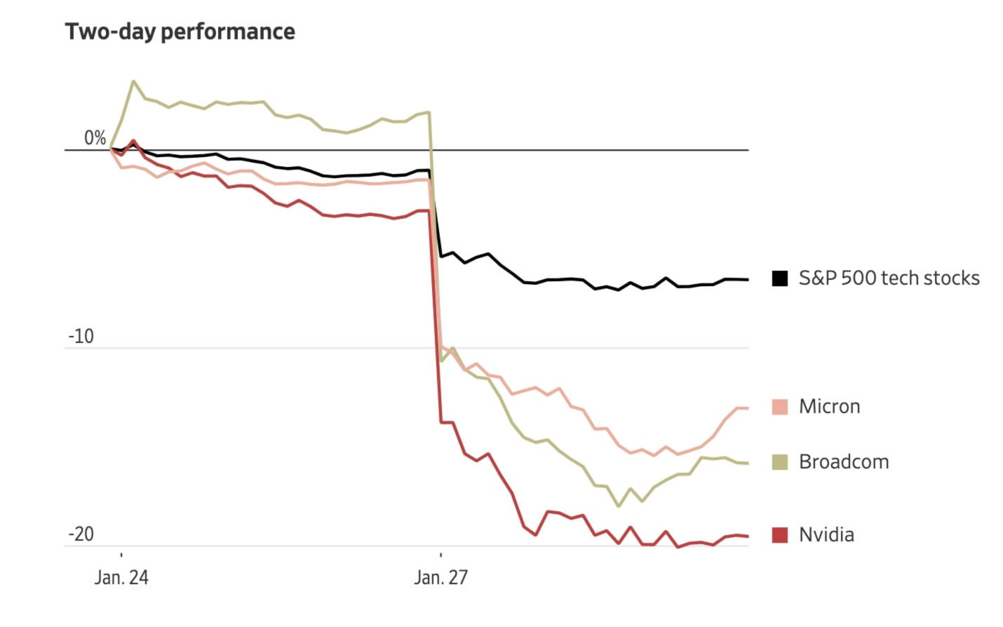 The market reactsNvidia, whose high-end chips have been used by the tens of thousands to power many leading AI models, saw its shares fall ~17% yesterday. The move wiped out ~$593 billion from the company’s market value – the biggest single-day figure in history by more than 2x. Other companies with AI infrastructure interests suffered double-digit losses, including Oracle (-14%), chipmakers Broadcom (-17%) and Micron (-12%), server maker Super Micro Computer (-13%), and power provider Constellation Energy (-21%). - Overall, Monday’s selloff removed ~$1 trillion from the US stock market’s value, per Dow Jones Market Data.