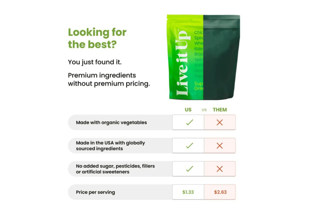 | Getting your recommended veggie intake takes time, preparation, and more money than ever. But Super Greens from Live It Up helps support your daily nutritional needs with one easy scoop at $1.33/serving. - 🥬 20+ all-natural superfood ingredients