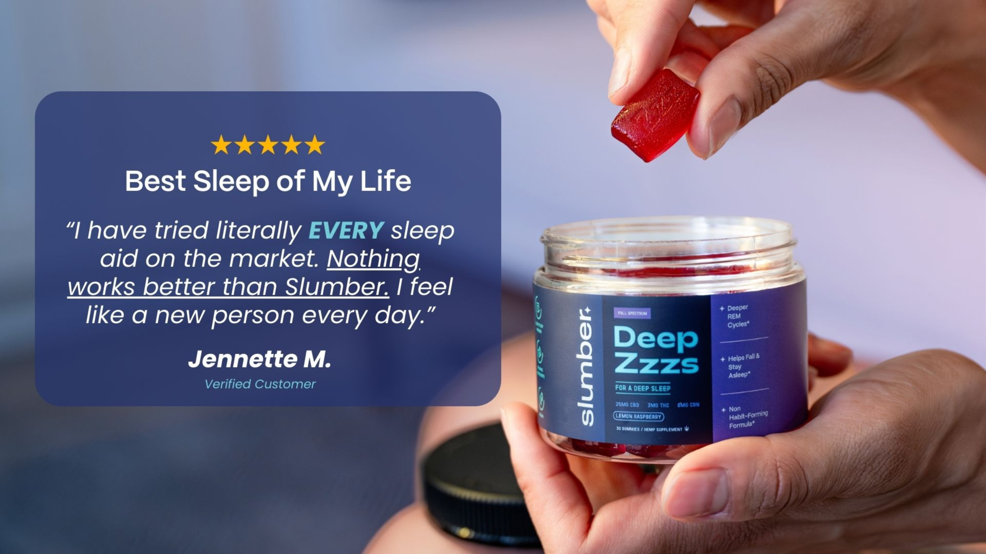 Slumber Deep Zzzs are 100% plant-based, non-habit-forming, melatonin-free, and have no groggy side effects. |