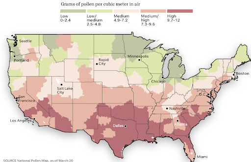 It’s sneezy season |  National Pollen Map as of March 20th, 2025; Image: The National Phenology Network | It’s time to stock up on Claritin and Flonaze: allergy season is here and getting longer and more intense in many parts of the country, according to the National Phenology Network, which uses the First Leaf and First Bloom Indices to track the official start of the season each year. The First Leaf index is based on the leaf out of lilacs and honeysuckles, which are among the first plants to show their leaves in the spring; the First Bloom coincides with the actual blooming of the flowers on those same plants. Per the indices: - Spring arrived over a week ahead of schedule in the mid-Atlantic and Northeast, and two weeks earlier than usual in several Midwestern states.