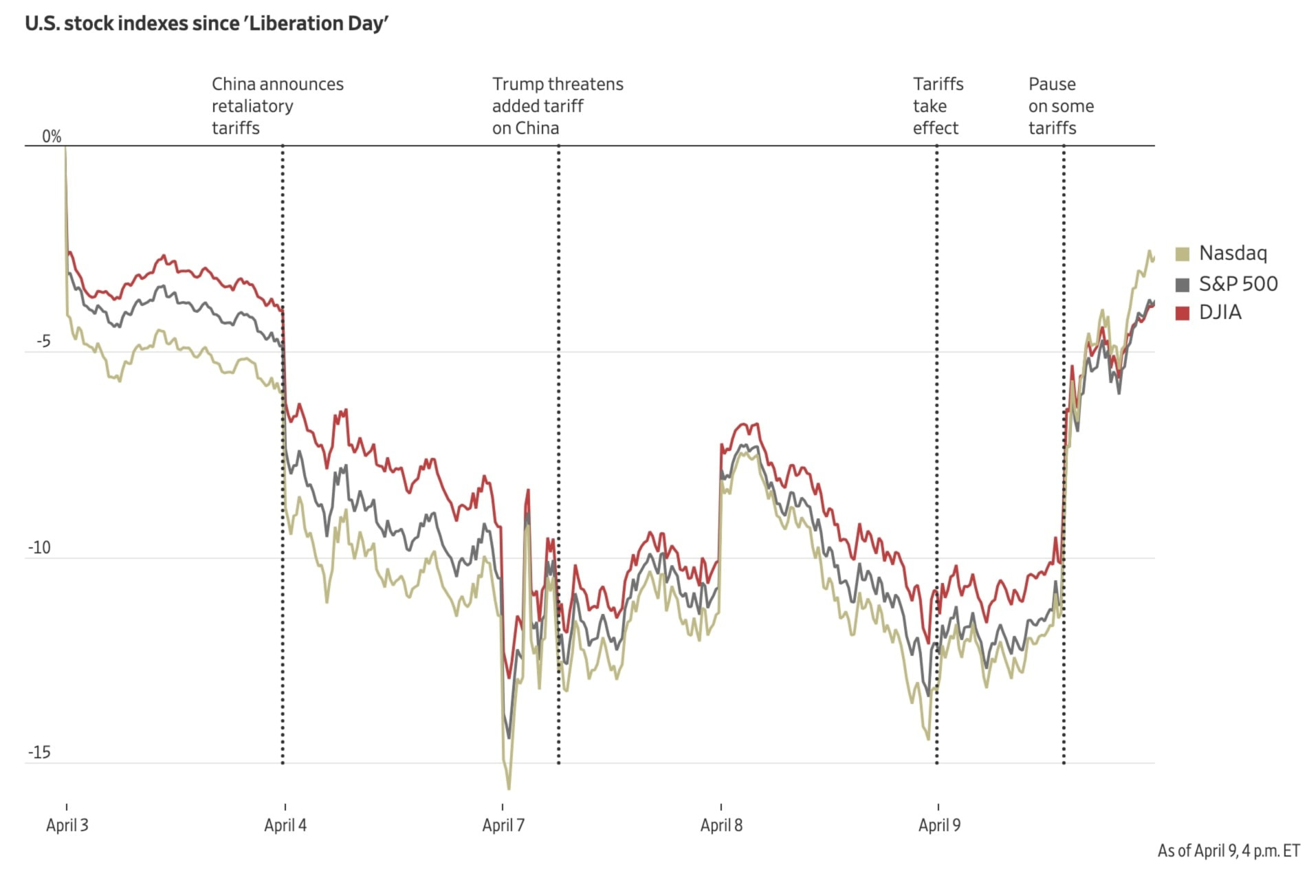 ⏱💥 Speed Rounds: Quick, Impactful Stories |  | Trump pauses some tariffs, escalates pressure on China |  Image: WSJ | US stocks went soaring like a kite without a string yesterday, after President Trump announced plans to enact a 90-day pause on certain tariffs for nearly 100 countries, while also keeping his across-the-board 10% tariff in place and ramping up duties on China. Catch up quickIn a Truth Social post shortly after noon CT, Trump said he authorized a 90-day pause in higher, individualized reciprocal tariffs for all countries outside of China, placing a hold on duties that had officially taken effect early yesterday morning. - While the 90-day pause is in effect, the countries will be subject to Trump’s flat 10% tariff instead of more elevated rates on an individual basis, the President said.