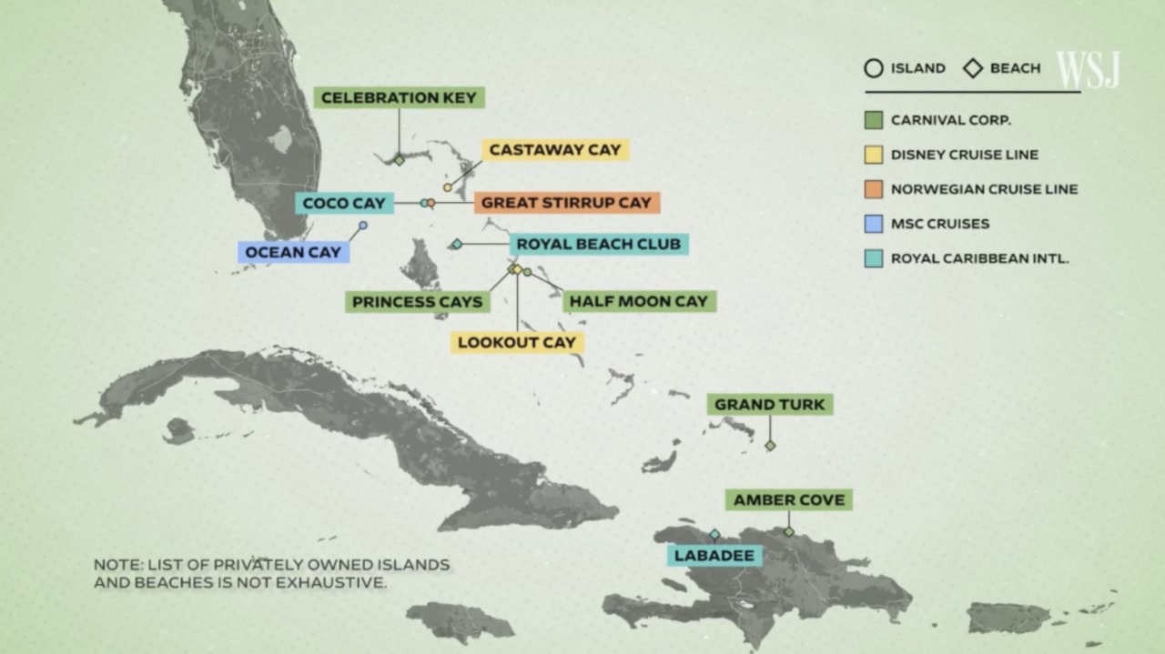 Cruise control: Why more ships are visiting in-house private islands |  Image: Wall Street Journal | Cruise companies are pulling a reverse Paul Revere—$1 if by sea, $2 if by land. In an effort to drum up revenue, these businesses with ships the size of countries are increasingly focusing their efforts on land-based ventures located on private islands that they’ve purchased. Cruise industry giants currently own ~20 such destinations in the Caribbean, and nearly every company is working to expand their holdings: - Royal Caribbean expects to launch four more properties by early 2027, at which point ~90% of its Caribbean cruises will sail to at least one in-house port.