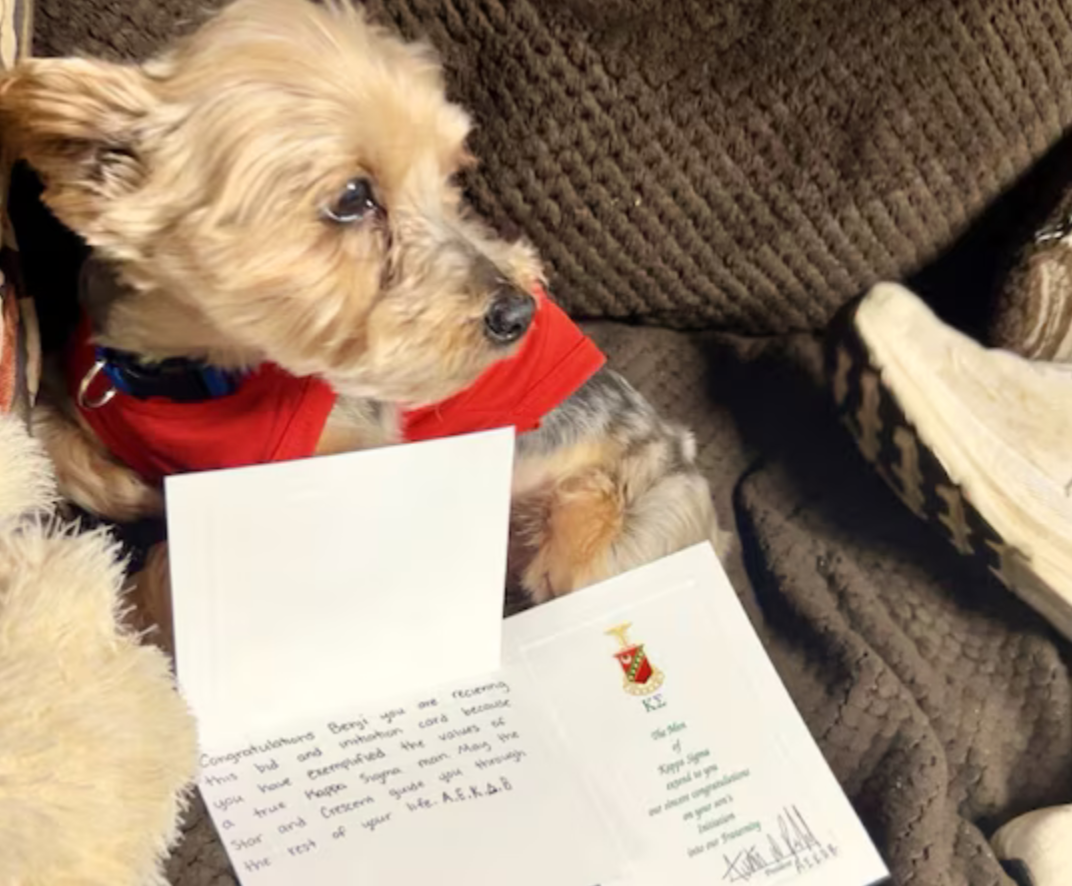 | An adventure to rival Homeward Boundβ¦It turns out, Kingston had gone on quite the journey. - He showed up 250 miles away at the Kappa Sigma house at the University of Southern Mississippi, and had been adopted by the fraternity brothers as one of their own. They even gave him an honorary induction into the Greek organizationπ.
