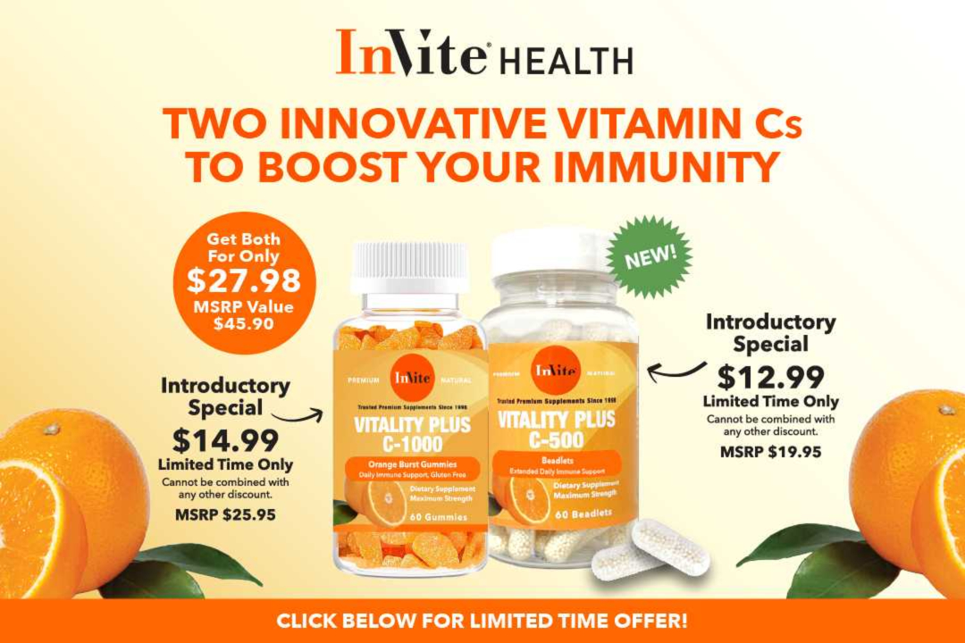 | Vitality Plus C-500 Beadlets—These innovative time-released Vitamin C Capsules are easy to swallow, helping to maximize absorption and bioavailability while minimizing digestive discomfort even more effectively than a buffered Vitamin C. Perfect for those seeking the most efficient immune support. Introductory Special $12.99 MSRP $19.95 Vitality Plus C-1000 Orange Burst Gummies—Orange Burst Gummies are a fun, delicious way to support your immune system. Each serving delivers a powerful blend of Vitamin C, plus added Vitamins A, E, and Zinc for enhanced immune and eye support with improved collagen formation for healthier skin. Introductory Special $14.99 MSRP $25.95 |